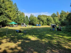 Ungünstig erschien die Lage der Veranstaltung in Hörpel sehr nahe an der A7. Die Anfahrt zur Veranstaltung war dadurch allerdings perfekt und gut zu erreichen ohne noch lange durch kleine Orte mit vielen Kurven schaukeln zu müssen. Die Anlage des Ortes, ein öffentlicher Grillplatz mit angrenzender Wiese bot für eine Distanzveranstaltung alles was man sich wünscht, es entstand keine Hektik beim Aufbau der Padocks sehr schön eingebunden in der Landschaft mit kleinen Waldstücken, so dass man meinen könnte es sei keine Autobahn in der Nähe, sondern mit etwas Phantasie ein Meeresrauschen zu hören. Kurze Wege zur Meldestelle auf dem Grillplatz, der großzügig überdacht war, rundeten den Standort ab. Also selbst bei schlechtem Wetter hervorragend geeignet für die Vorbesprechung und ein Kennenlernen oder den Austausch mit begeisterten Pferdsportlern. Auf einer separaten Wiese war das Vetgate mit guten Bedingungen vom Boden und Platzverhältnissen eingerichtet.